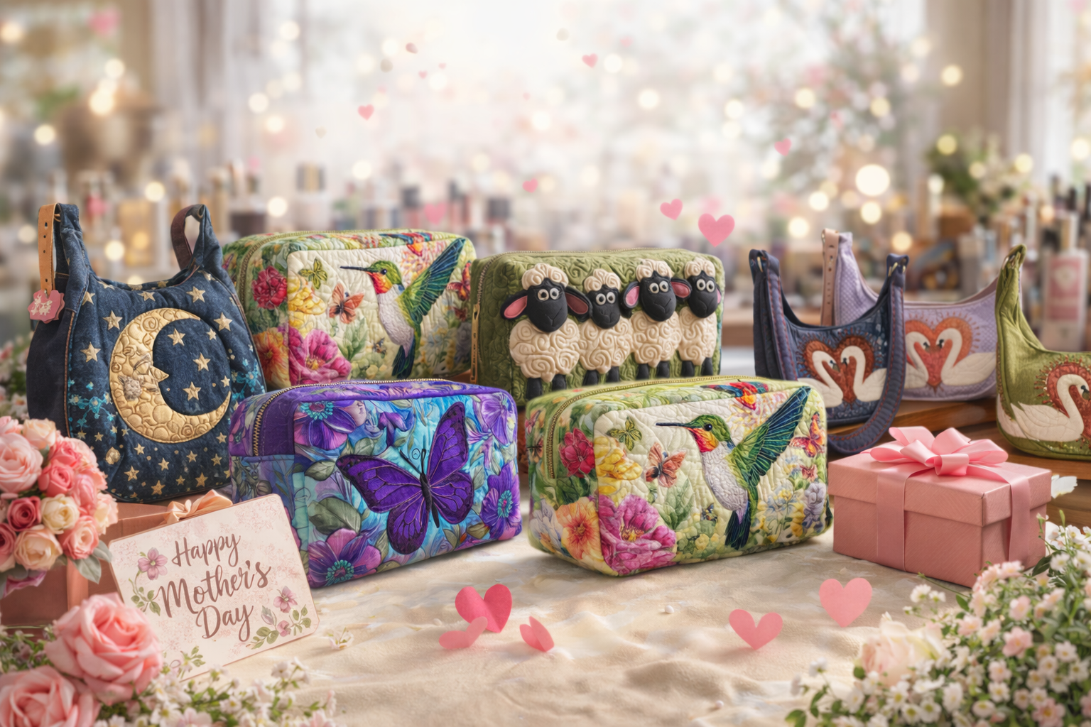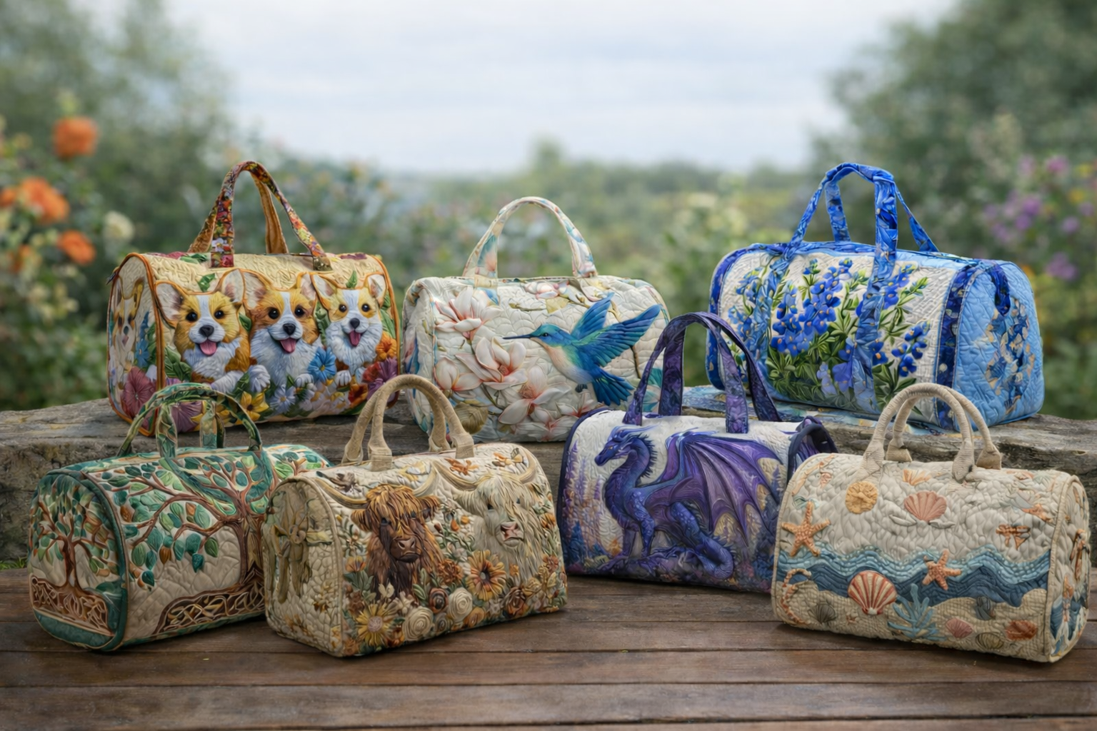 - These quilted duffle bags feature vibrant, artistic designs that blend practicality with personality. From floral and animal-inspired patterns to whimsical fantasy and nature themes, each bag offers a unique handcrafted look that stands out for travel, weekend trips, or everyday use.