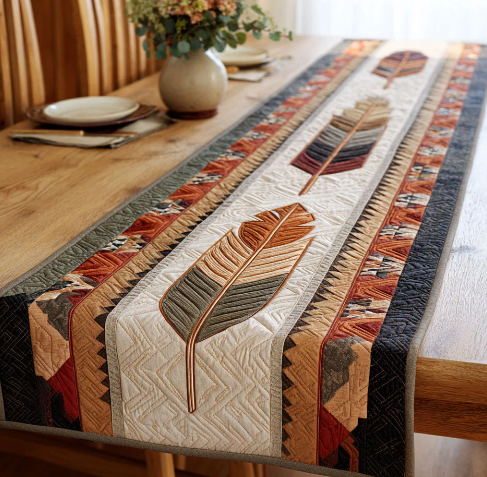 Western Rustic Style Embroidered Feather & Geometric Star Pattern Quilted Table Runner with Prairie Tribal Decor | Western Rustic Style