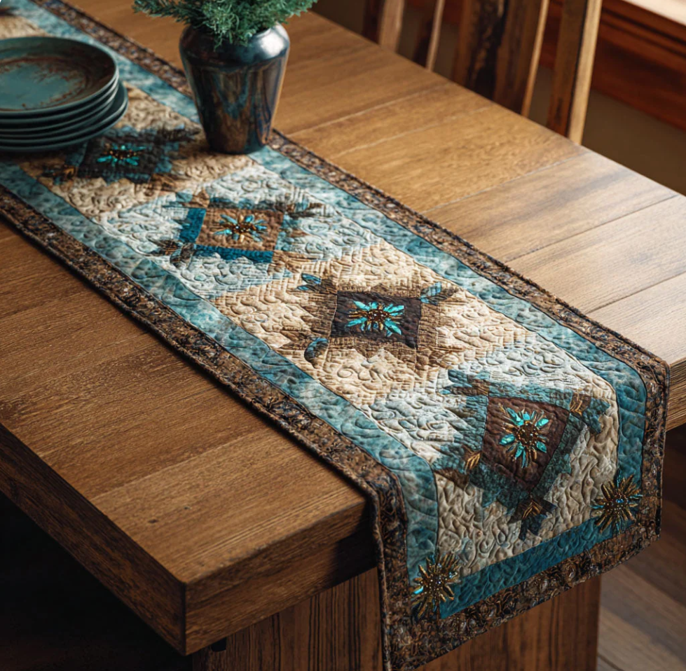 Western Rustic Style Embroidered Feather & Geometric Star Pattern Quilted Table Runner with Prairie Tribal Decor | Western Rustic Style