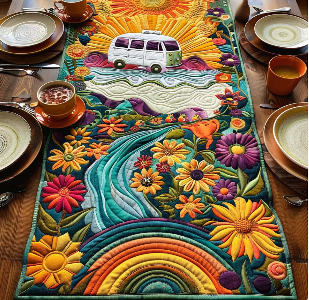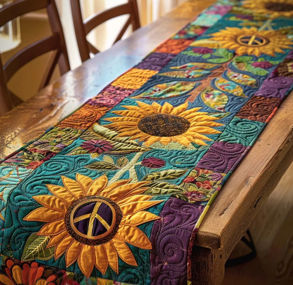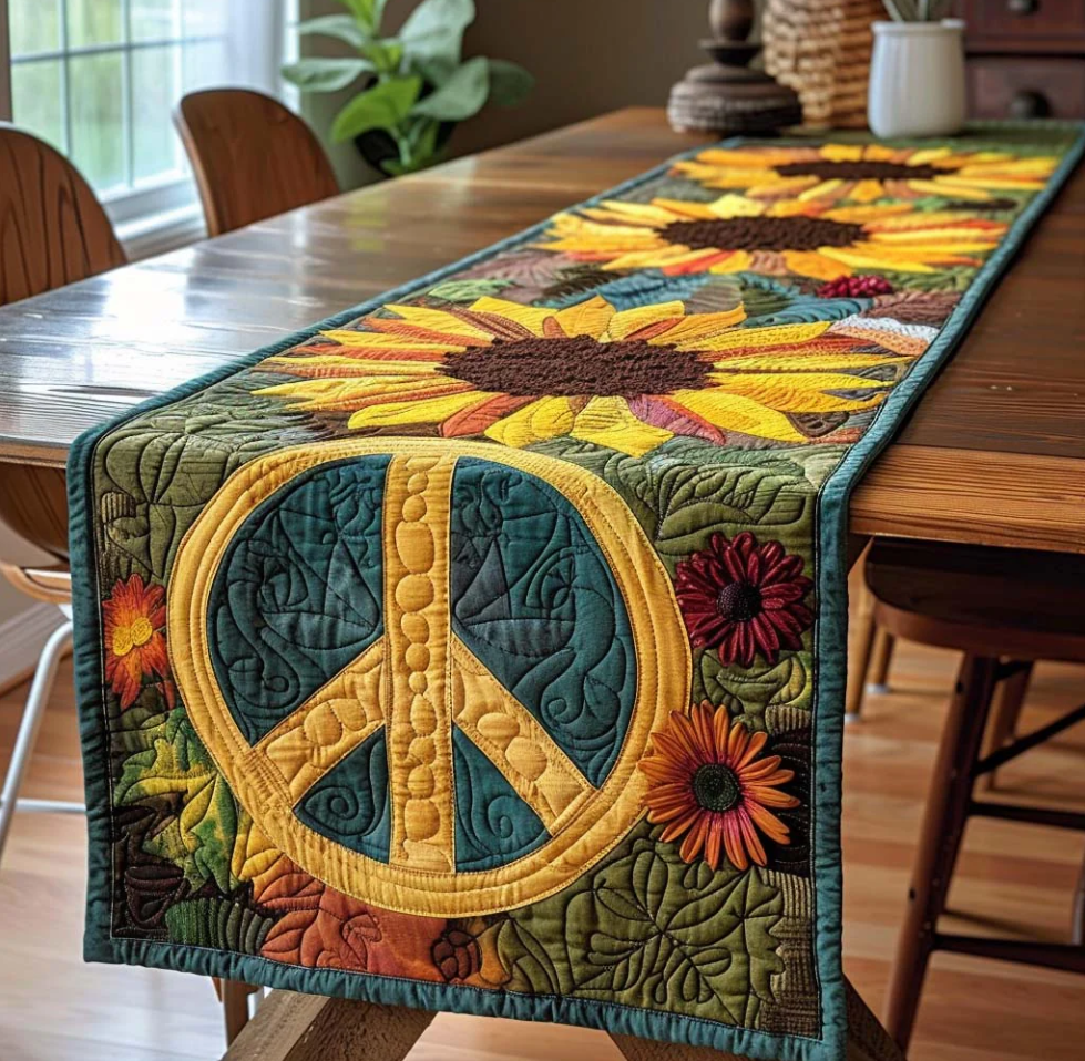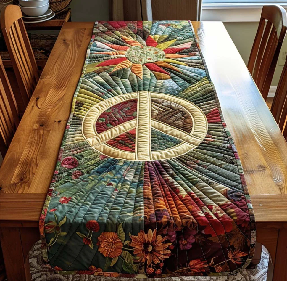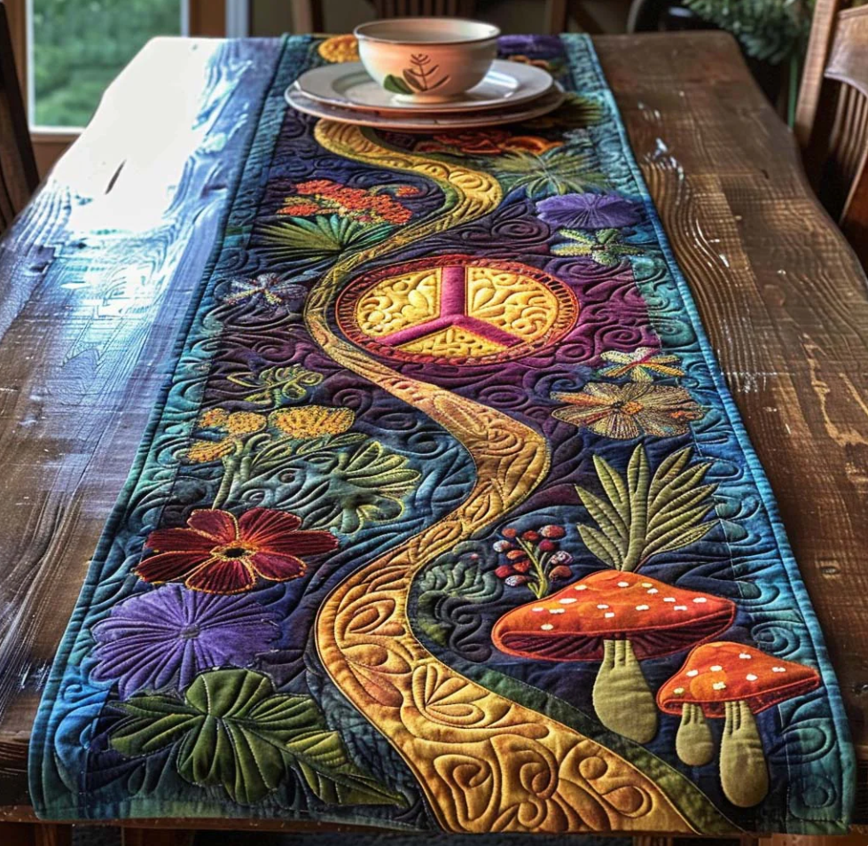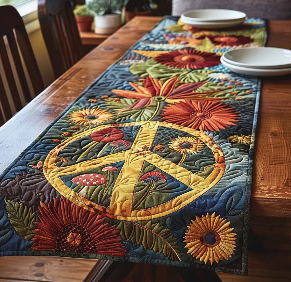Bohemian Style Embroidered Peace Sign & Floral Pattern Quilted Table Runner with Retro Nature Inspired Decor | Bohemian Style