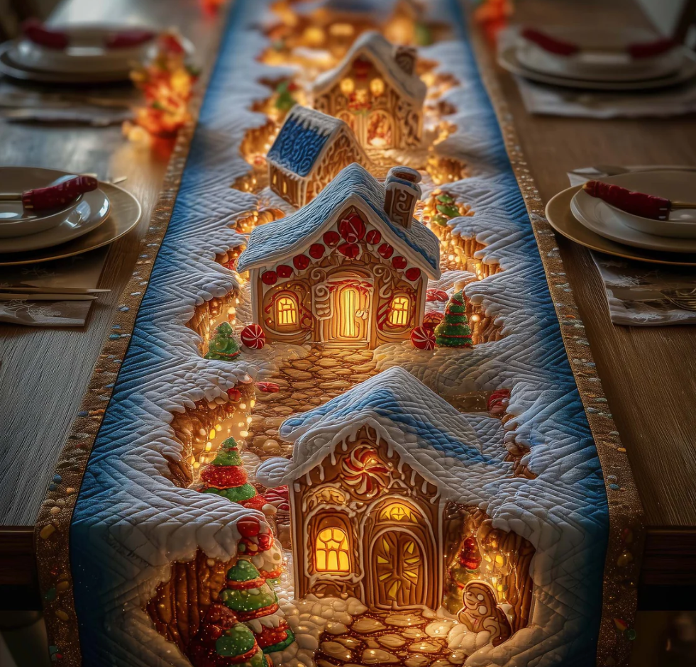 Gingerbread House Print Quilted Table Runner - Machine Washable Home Decor | House