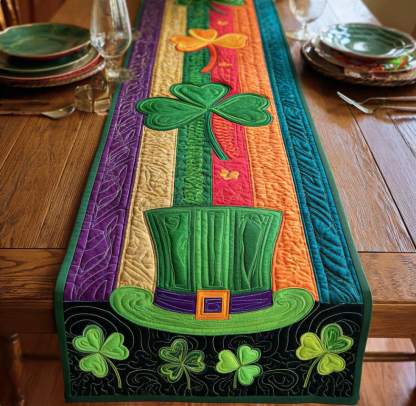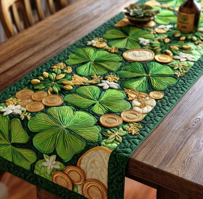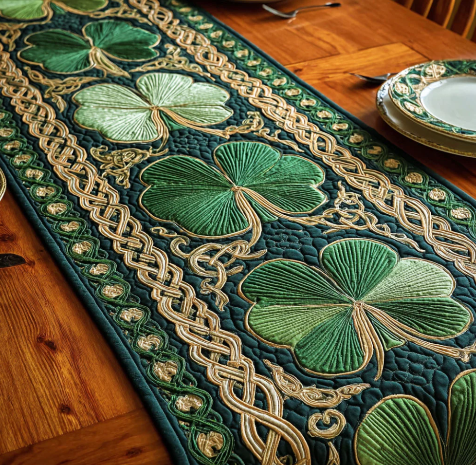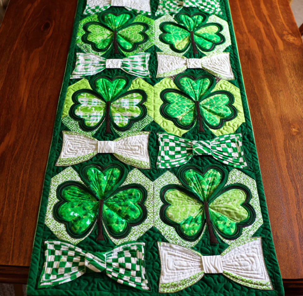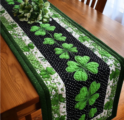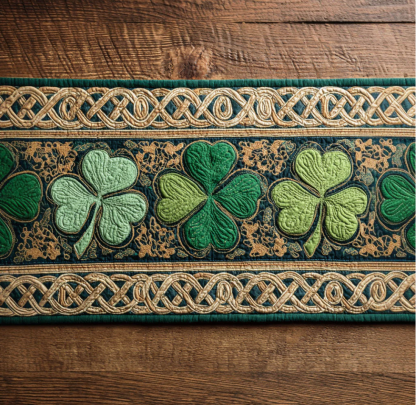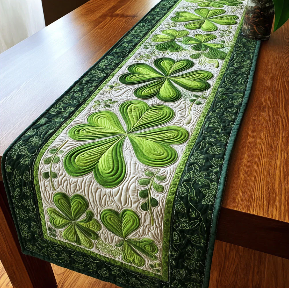 Irish Lucky Style Embroidered Clover Heart Pattern Quilted Table Runner with Exquisite Stitching Decor | Shamrock