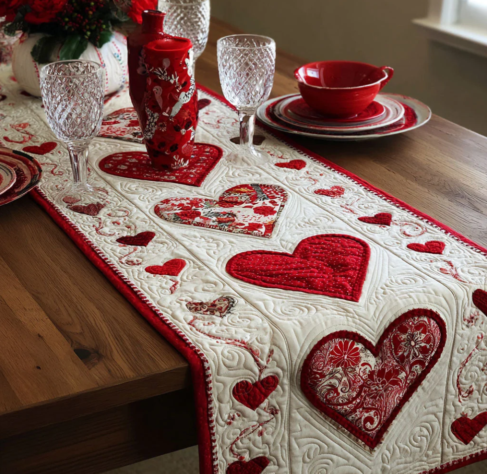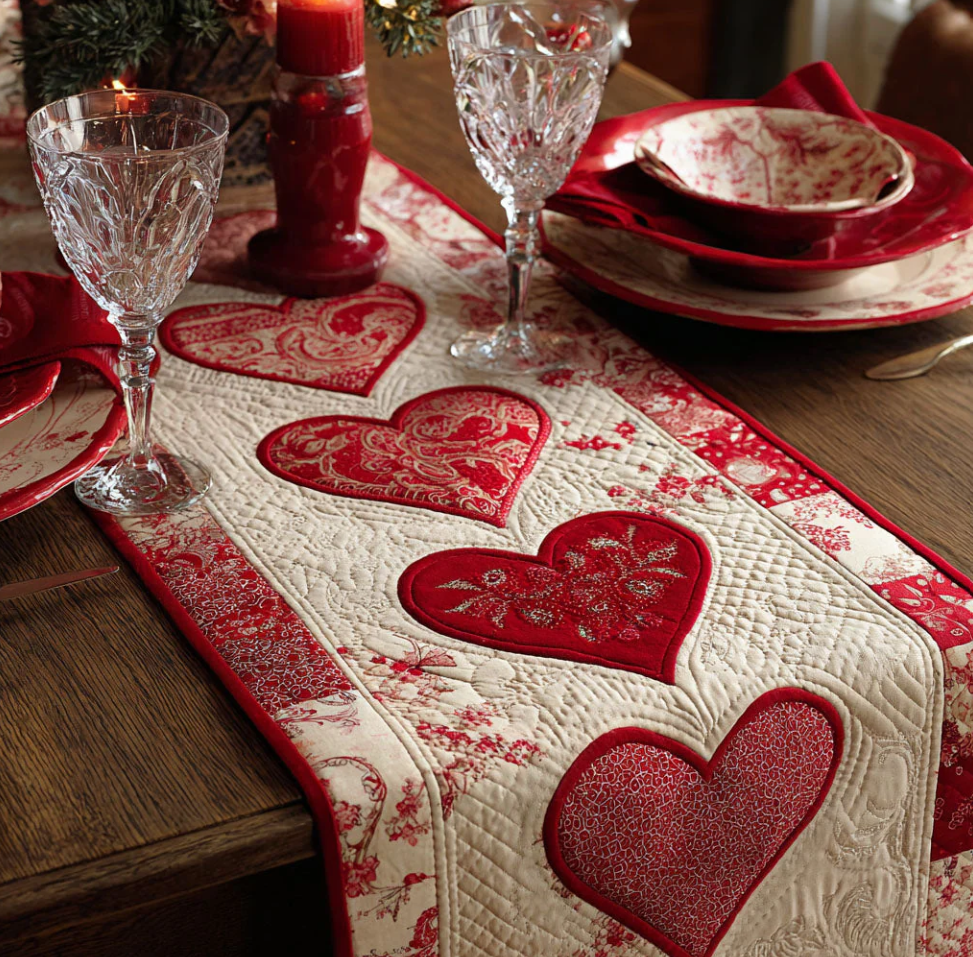 Romantic Love Themed Embroidered Heart Pattern Quilted Table Runner with Patchwork Design & Soft Textured Decor | Love