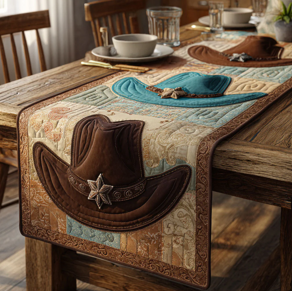 Western Cowboy Style Embroidered Cowboy Hat & Star Pattern Quilted Table Runner with Rustic Ranch Decor | Hat