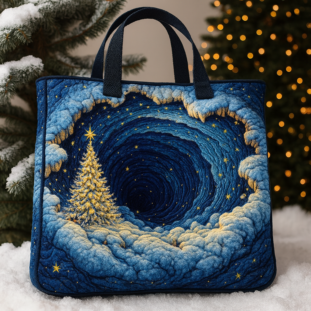 Starlit Snow Tree Quilted Tote Bag – Winter Galaxy 3D Embroidery Edition